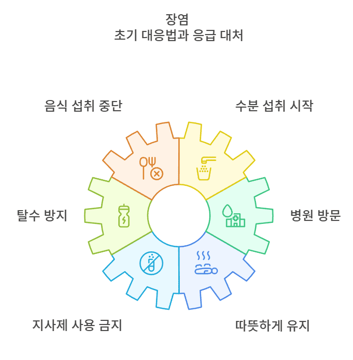 장염은 빠르게 진행되기 때문에 초기에 적절히 대응하는 것이 매우 중요합니다. 아래 리스트는 집에서 바로 실천할 수 있는 실질적인 초기 대응법입니다.